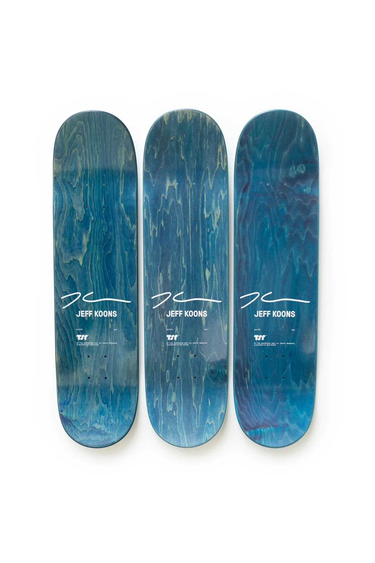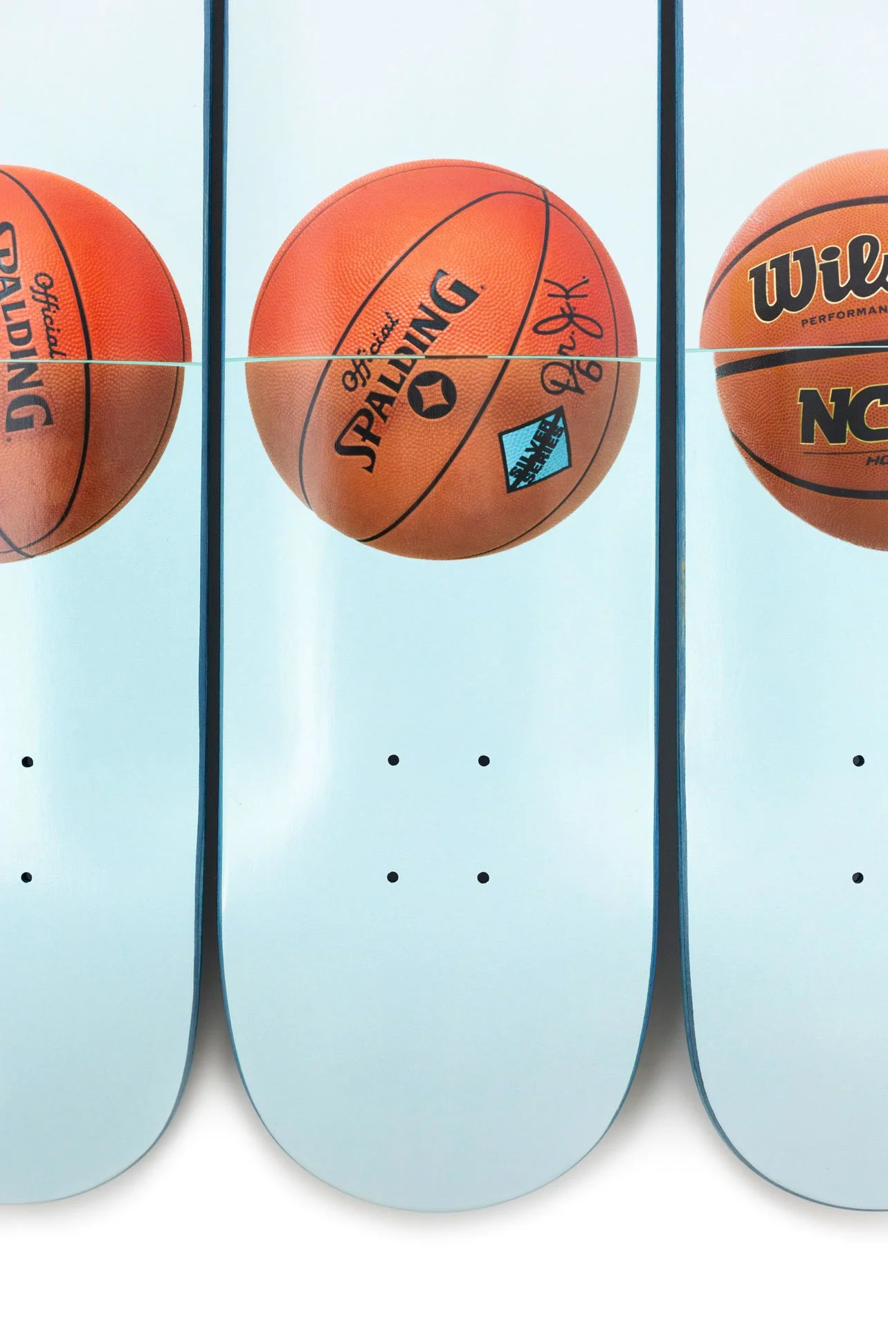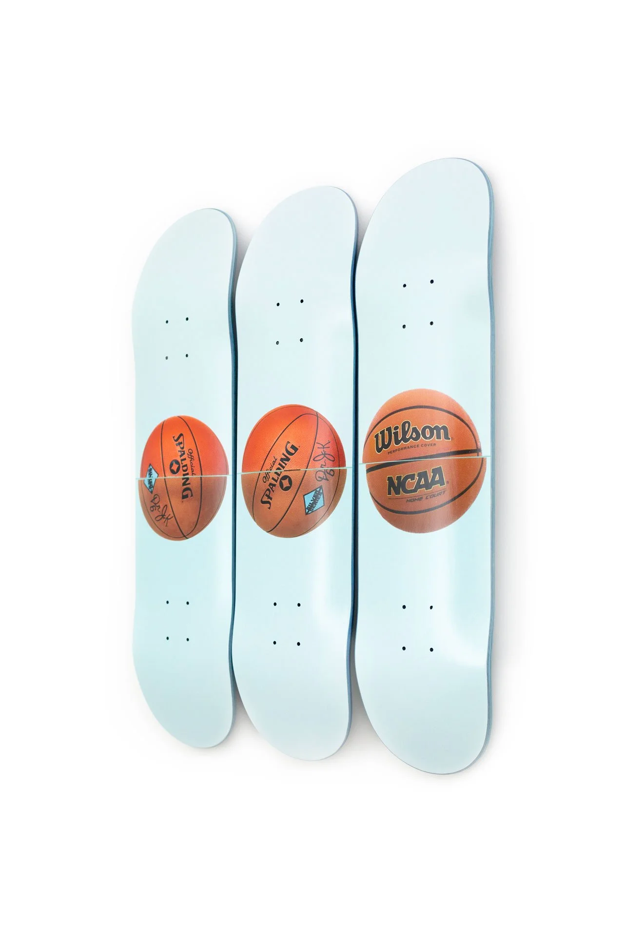Jeff Koons focuses on three basketballs hovering in equilibrium in his Three Ball 50/50 Tank (Spalding Dr. JK Silver Series, Wilson Supershot) Skateboard. In his Equilibrium series, Koons received guidance from Nobel laureate physicist Dr. Richard P. Feynman, as Koons strived to achieve permanent equilibrium by suspending basketballs inside water tanks. Presented as a triptych, we see exactly half of each ball submerged below the water and half on top, miraculously floating. However, the balls will remain 50% submerged below the water line but due to vibrations, the balls will move to the left or rights of the tanks. The balls are a philosophical reference to existentialism from the womb to the eternal.