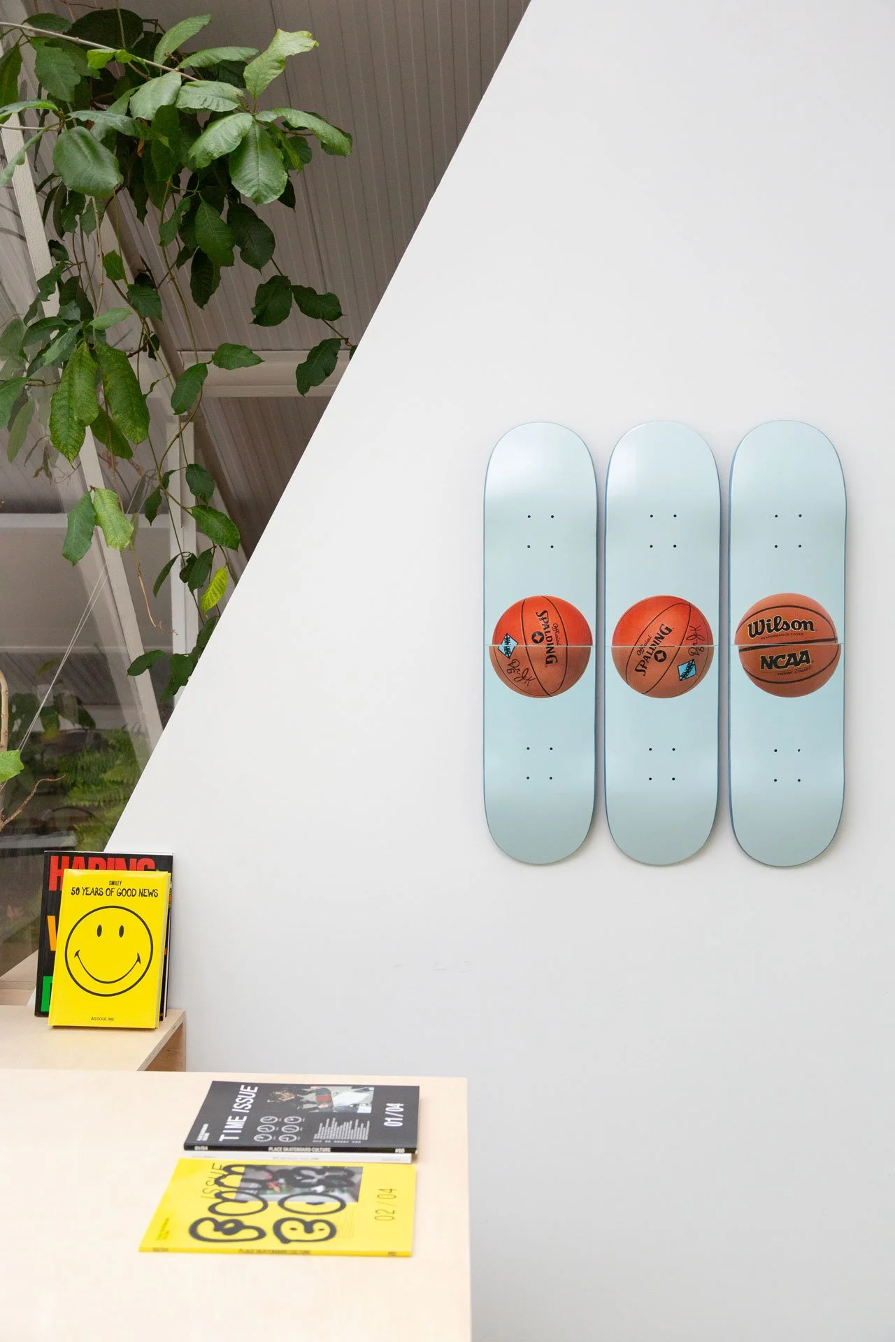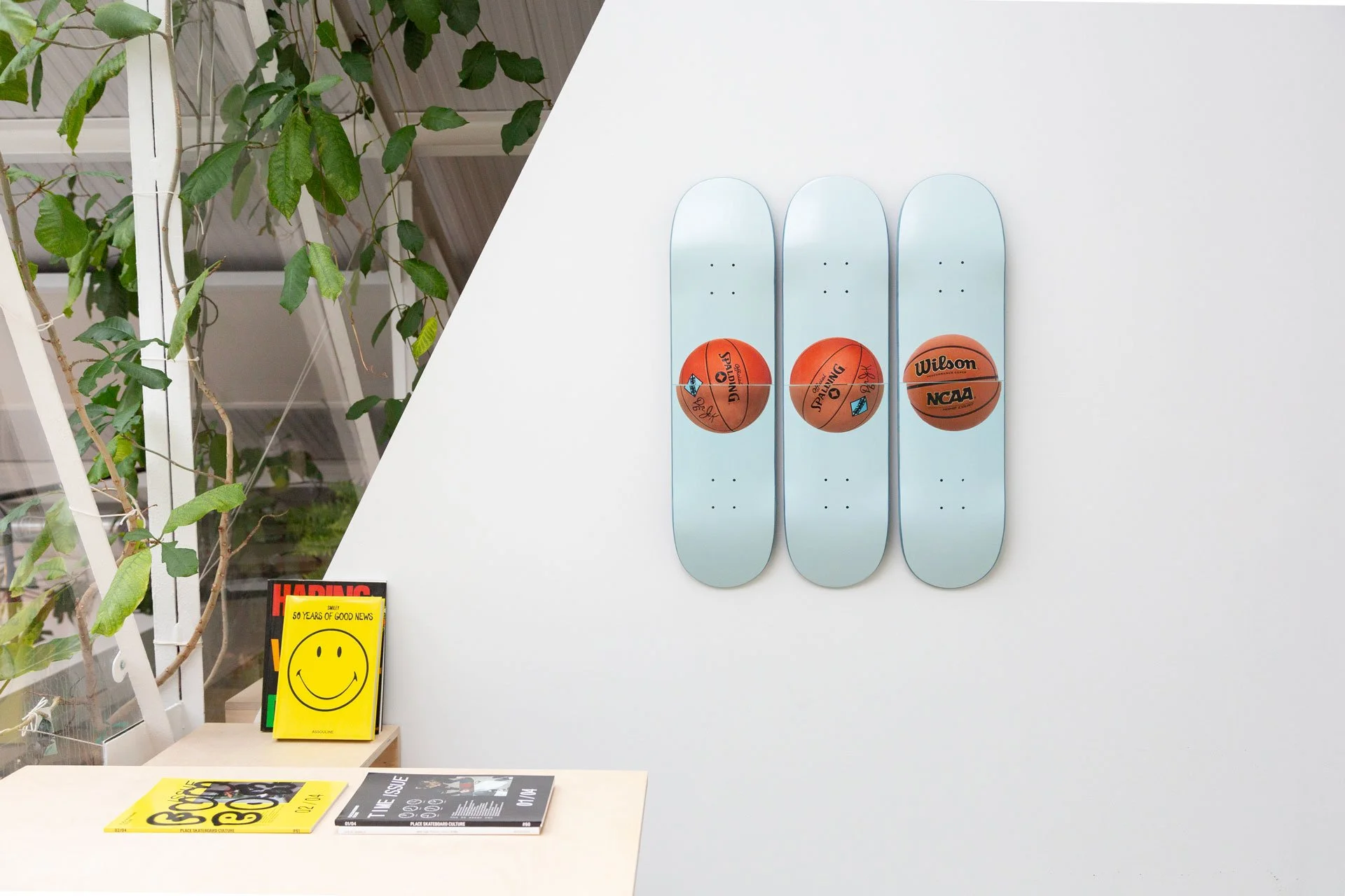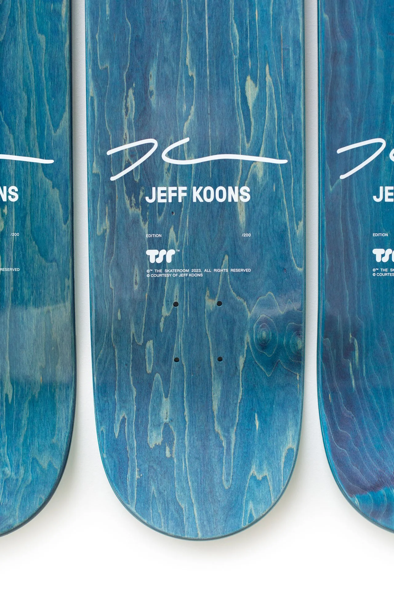 Jeff Koons focuses on three basketballs hovering in equilibrium in his Three Ball 50/50 Tank (Spalding Dr. JK Silver Series, Wilson Supershot) Skateboard. In his Equilibrium series, Koons received guidance from Nobel laureate physicist Dr. Richard P. Feynman, as Koons strived to achieve permanent equilibrium by suspending basketballs inside water tanks. Presented as a triptych, we see exactly half of each ball submerged below the water and half on top, miraculously floating. However, the balls will remain 50% submerged below the water line but due to vibrations, the balls will move to the left or rights of the tanks. The balls are a philosophical reference to existentialism from the womb to the eternal.
