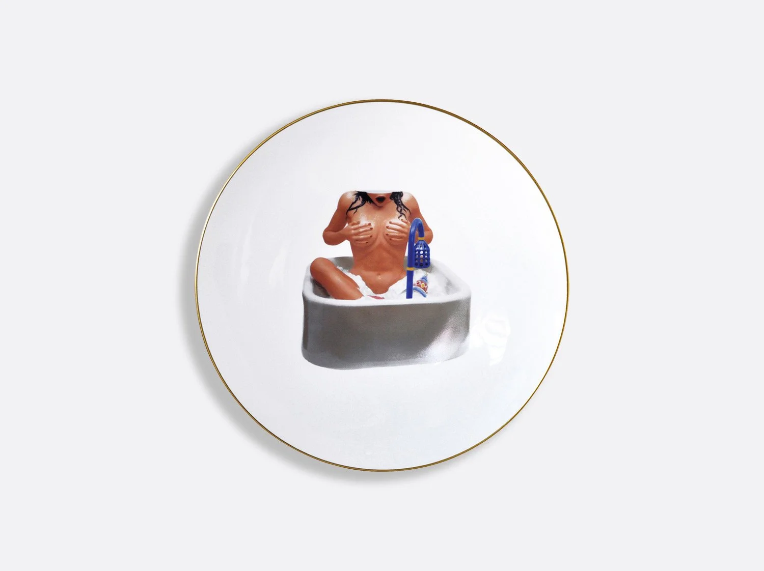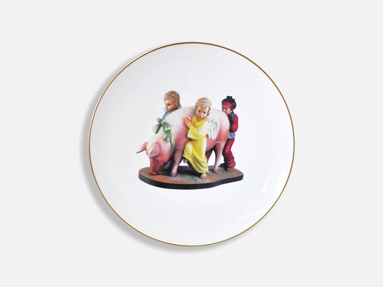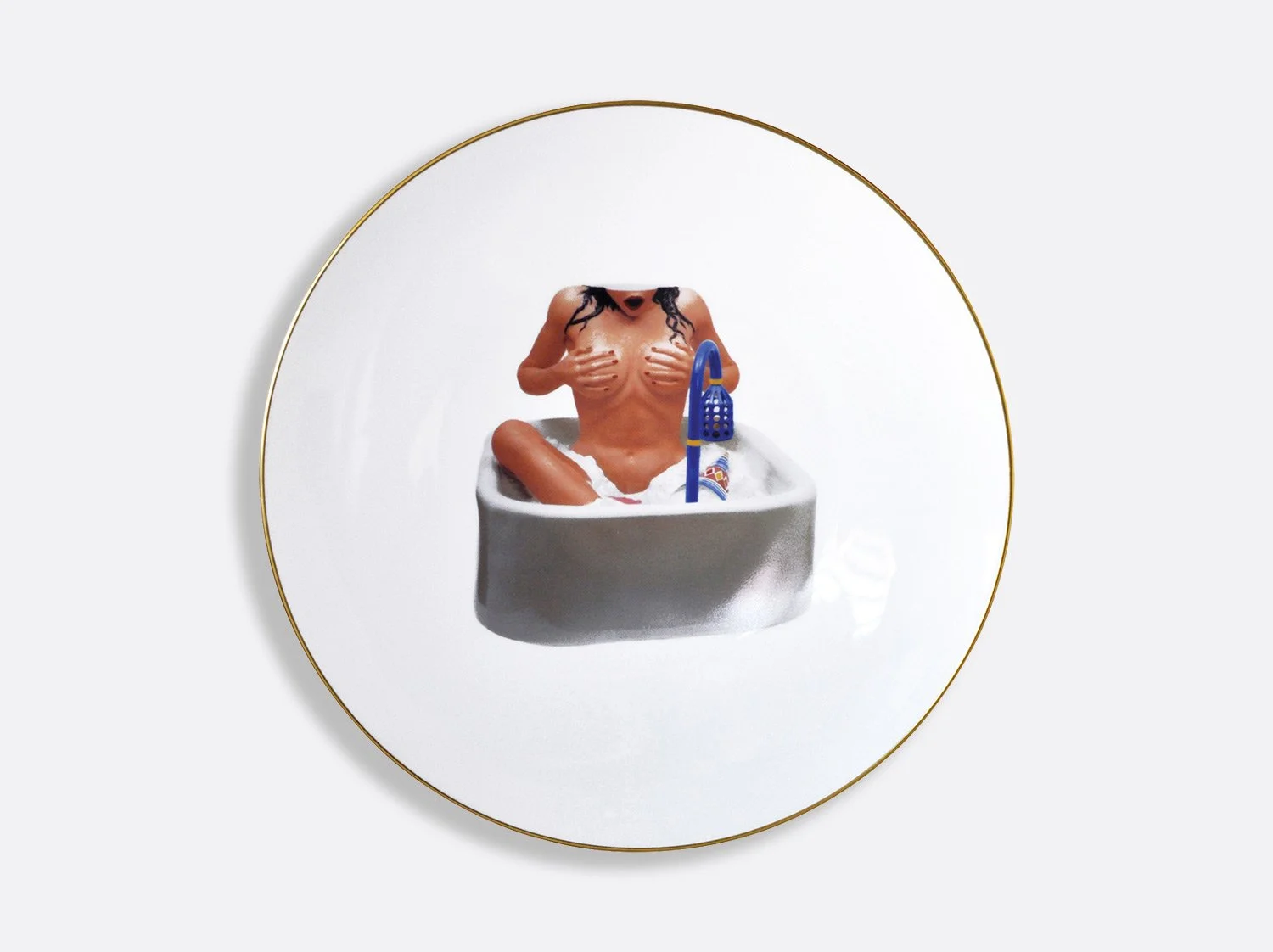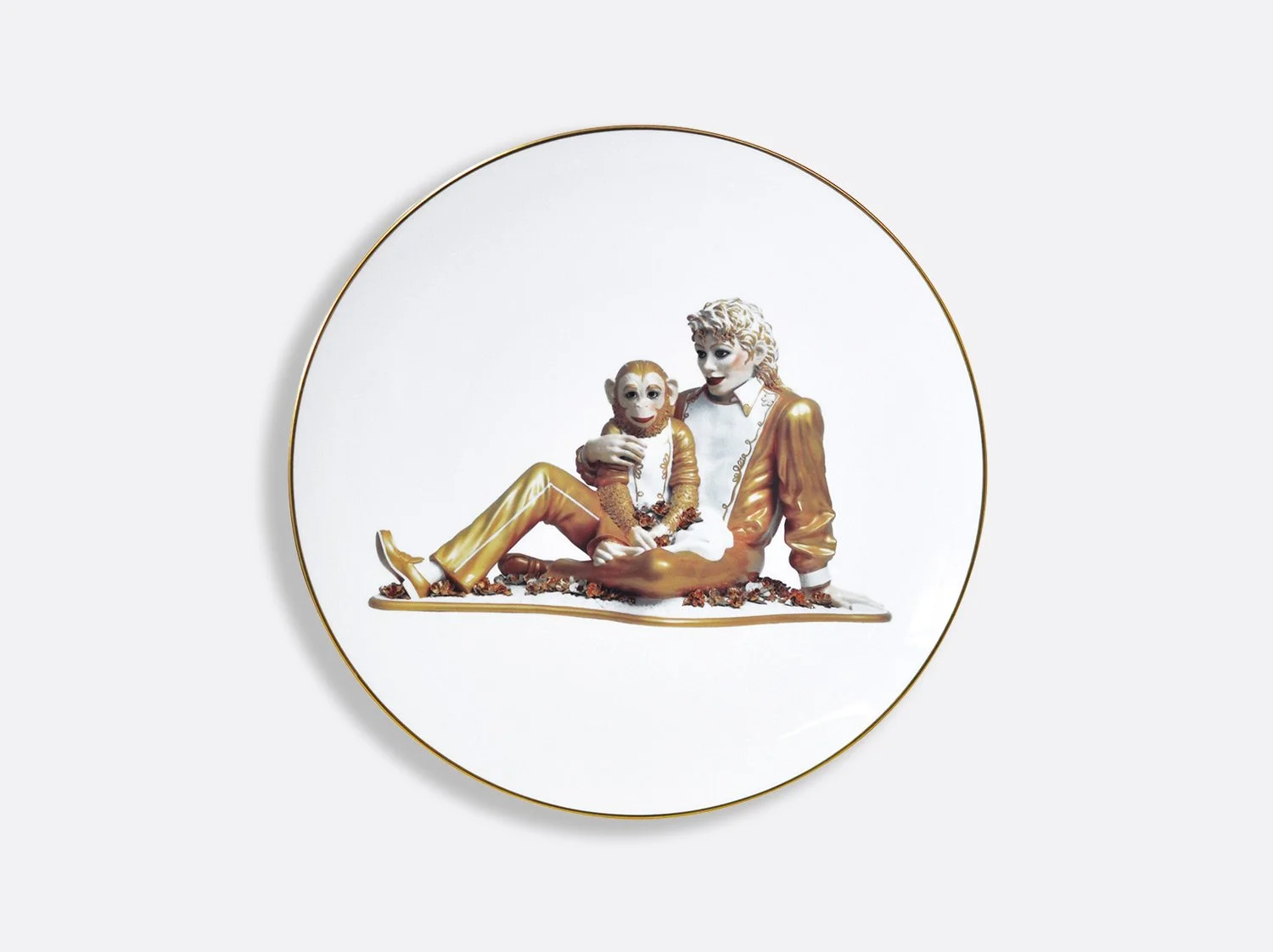 The Ballerinas coupe service plate designed by Jeff Koons, features an image of his sculpture Ballerinas (2010–14) from the iconic Antiquity series. Inspired by a small porcelain figurine of two dancers, the artist transformed the ready-made into a monumental sculpture that stands over eight-feet tall. The artwork communicates beauty, hope, and a sense of affirmation while the reflective surface with its subtle color gradations deal with time and metaphysics.