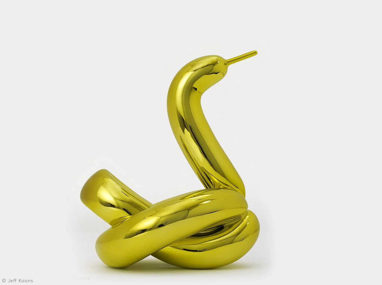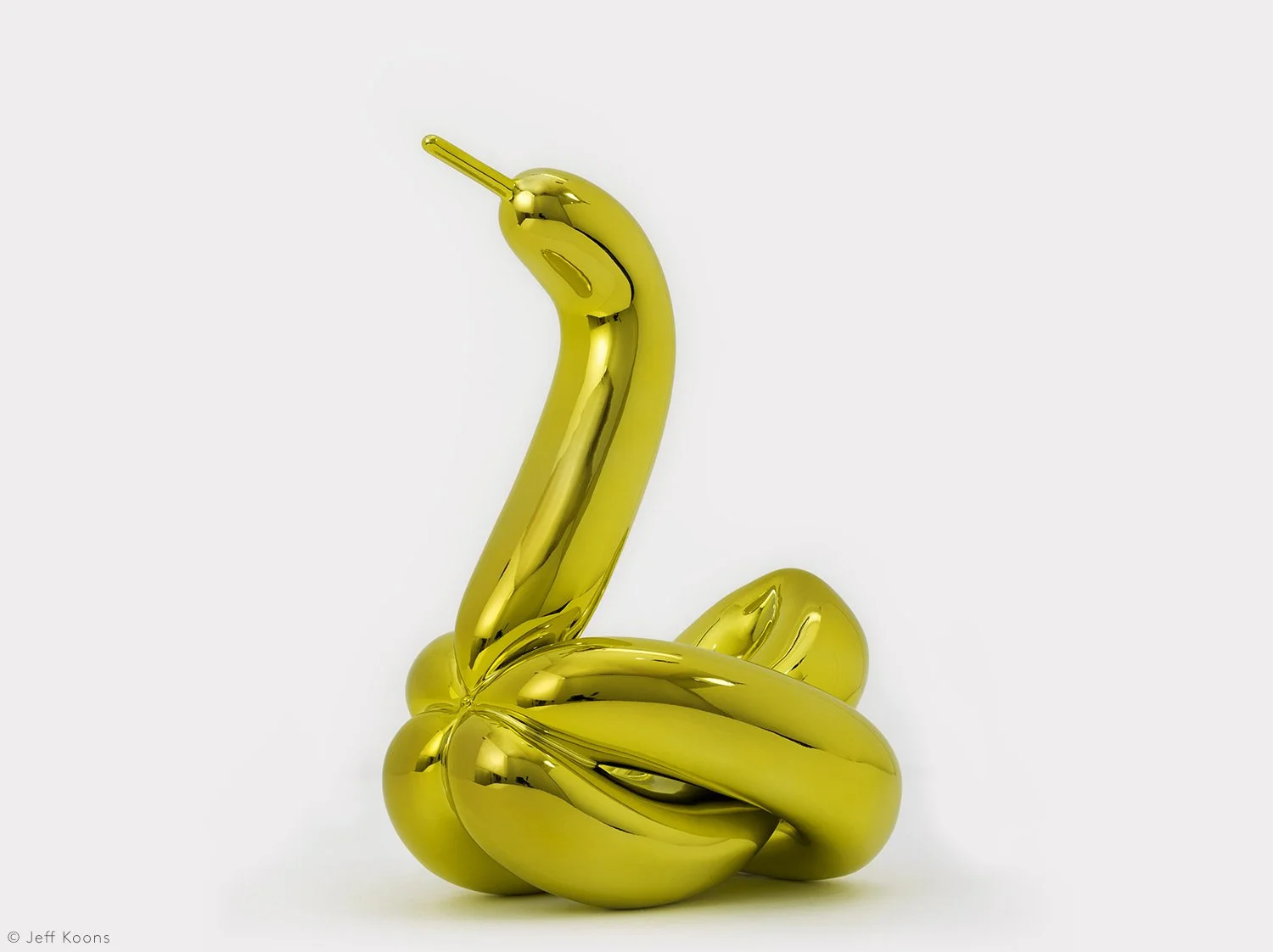 Jeff Koons transforms a simple twisted balloon swan into a reflective yellow porcelain for his limited edition, Balloon Swan (Yellow). The original Balloon Swan, 2004–2011, is a monumental sculpture, standing over 3 meters high, in mirror-polished stainless steel with transparent color coating in five unique versions: magenta, red, violet, blue, and yellow.