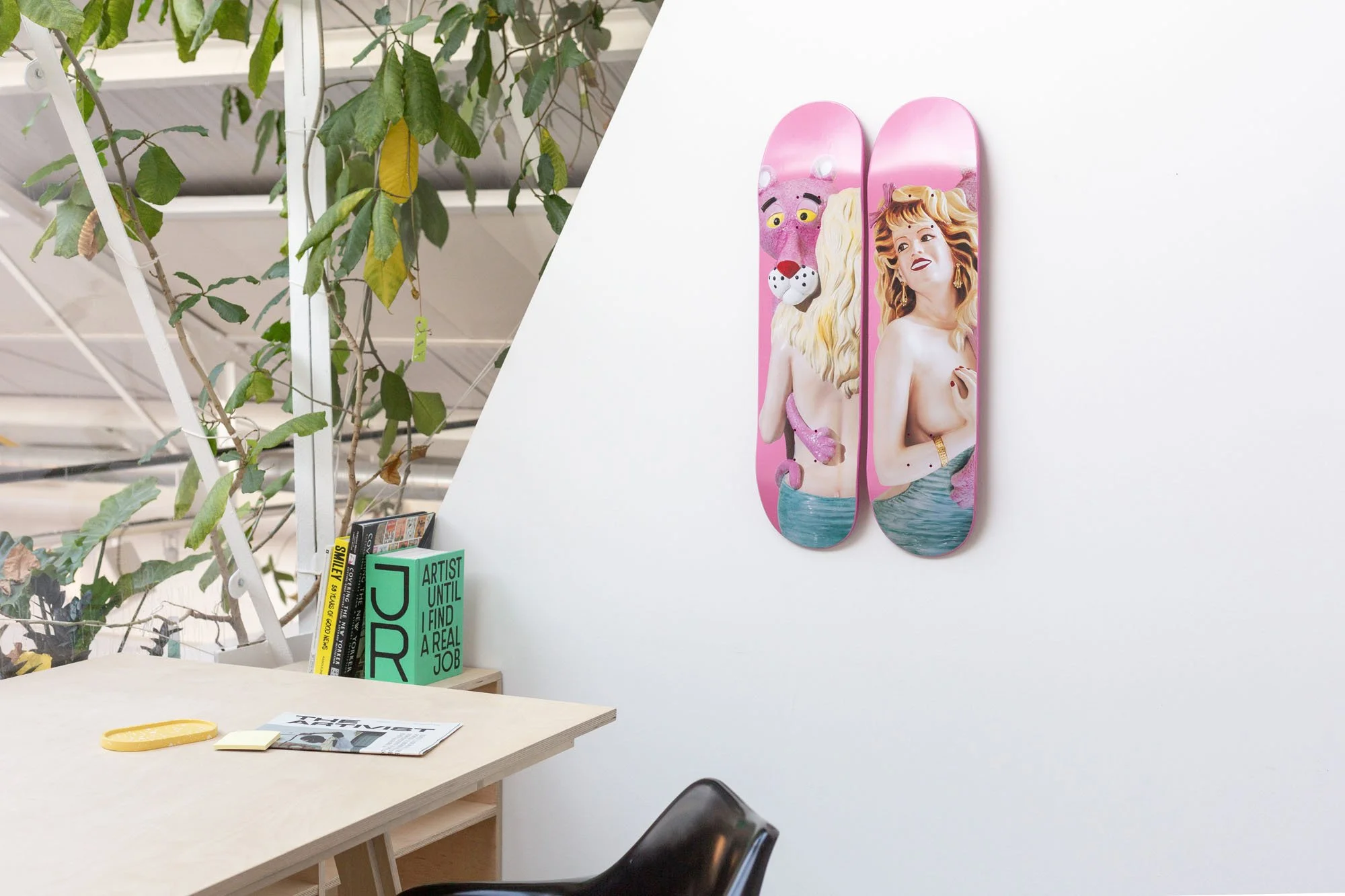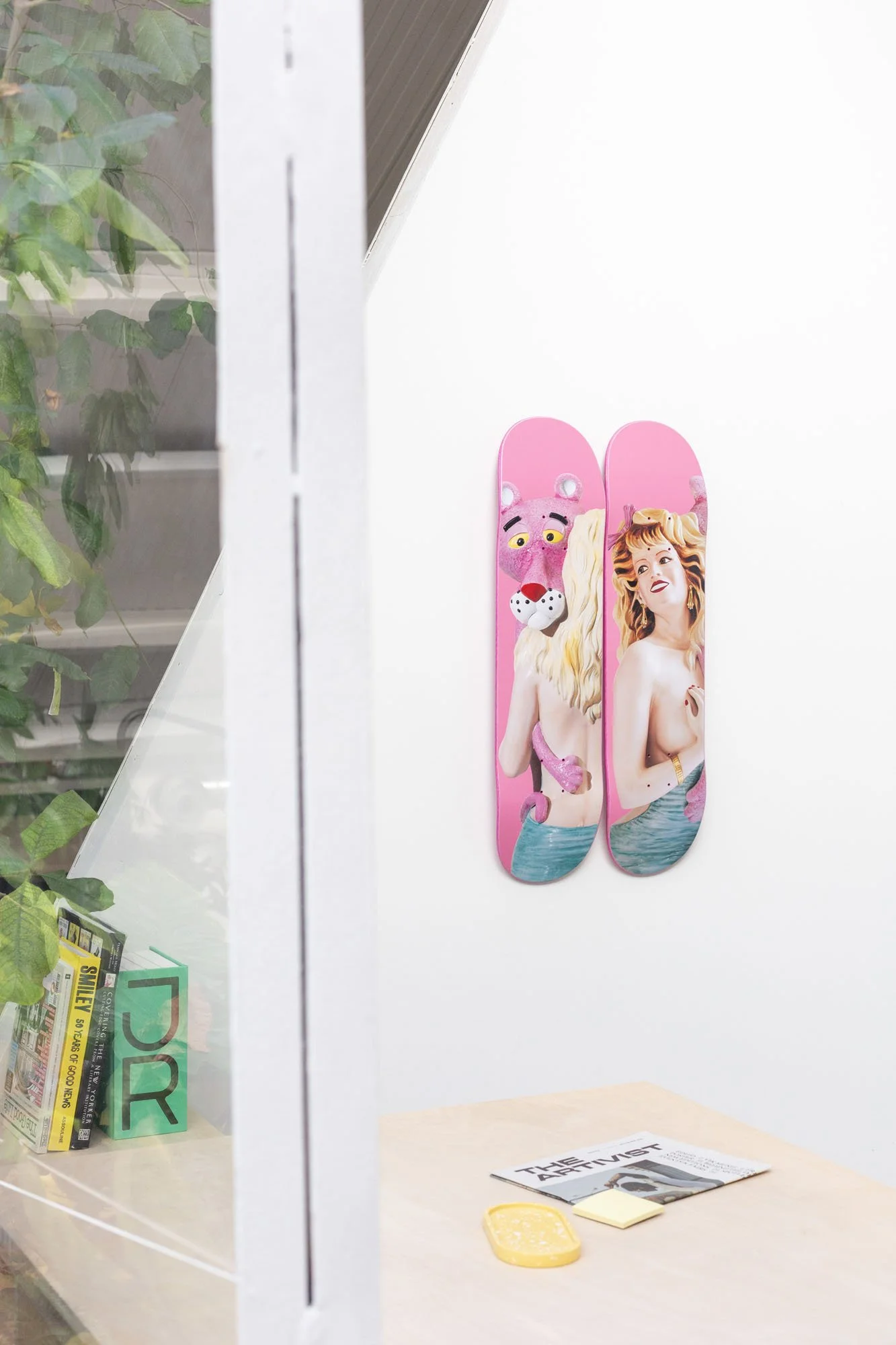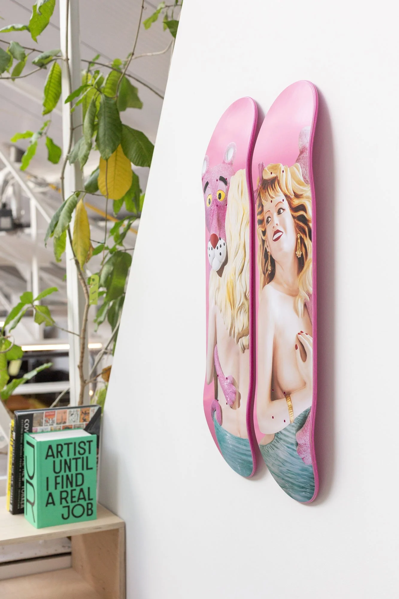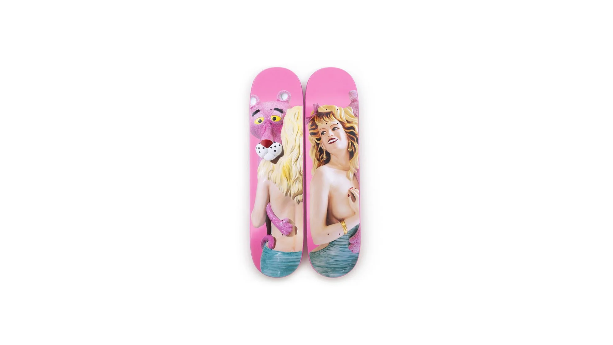 Pink Panther belongs to the Banality series, which was first presented in 1988. The artworks in Banality were a metaphor for the viewer’s cultural guilt and shame. Koons was communicating that through self-acceptance one can be empowered. The porcelain sculpture represents a voluptuous pin-up woman embracing the Pink Panther. The work explores taste, desire, and the abundance of references within our cultural history. The Pink Panther Skateboard diptych includes both facial expressions of Pink Panther and the woman in their sensual embrace; it's about control and giving up control.