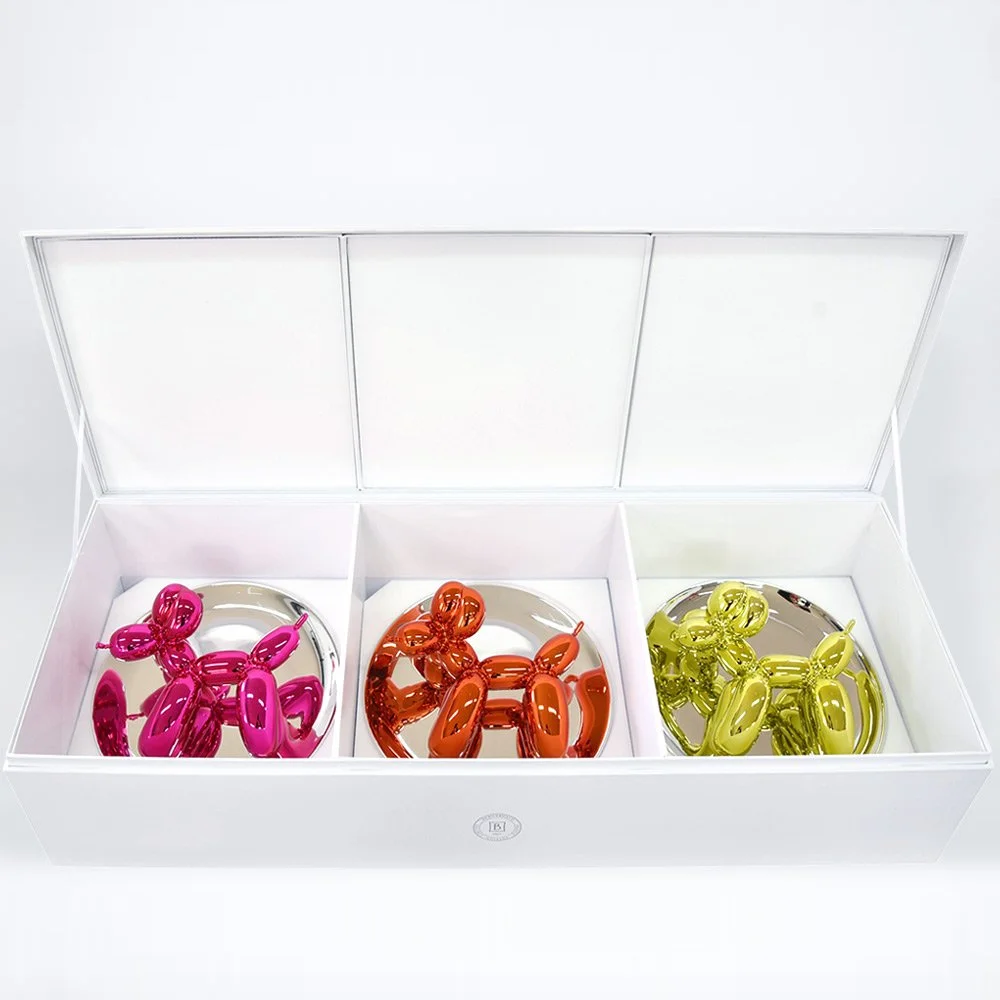 An elegant box combining the three Balloon Dog, one of each color, each with the same numbering. Limited Edition. Balloon Dog is an iconic work within the highly acclaimed Celebration series, which Jeff Koons began in the mid-1990s. The Celebration artworks reference certain times of year (holidays and birthdays) but also the celebration of the cycle of life. What else could suggest the cheer of children’s parties more eloquently than a colorful balloon, twisted into the instantly recognizable form of a dog. According to the artist, “It is about celebration and childhood and color and simplicity – but it’s also a Trojan horse. It’s a Trojan horse to the whole body of art work.” Balloon Dog has the profoundness of an archaic sculpture.