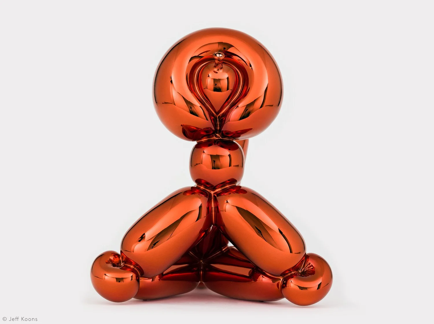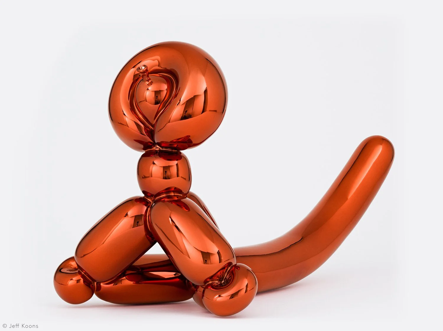 Balloon Monkey (Orange), by Koons, is based on a balloon that is twisted into the shape of a monkey. Seven years in the making, the original Balloon Monkey, 2006–2013, is 12 ½ feet long and weighs nearly five tons. The monumental sculpture is made from mirror-polished stainless steel finished with transparent color coating in five unique versions: blue, magenta, orange, red and yellow.