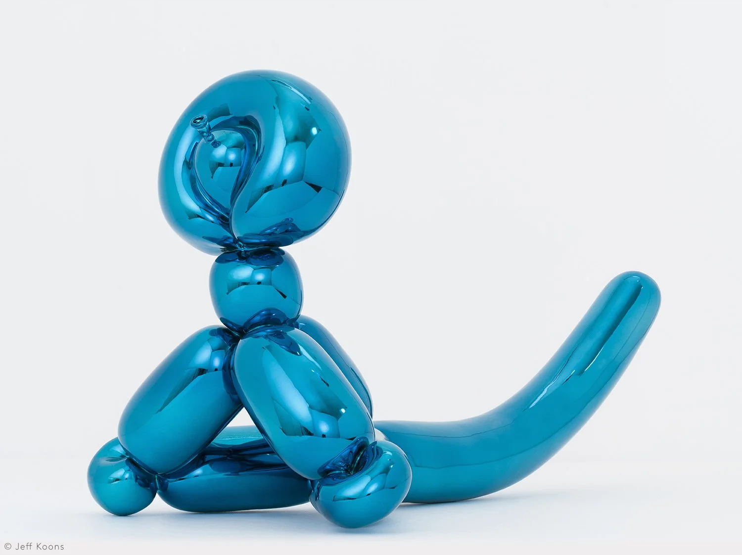 Balloon Monkey (Blue) by Koons, is based on a balloon that is twisted into the shape of a monkey. Seven years in the making, the original Balloon Monkey, 2006–2013, is 12 ½ feet long and weighs nearly five tons. The monumental sculpture is made from mirror-polished stainless steel finished with transparent color coating in five unique versions: blue, magenta, orange, red and yellow.