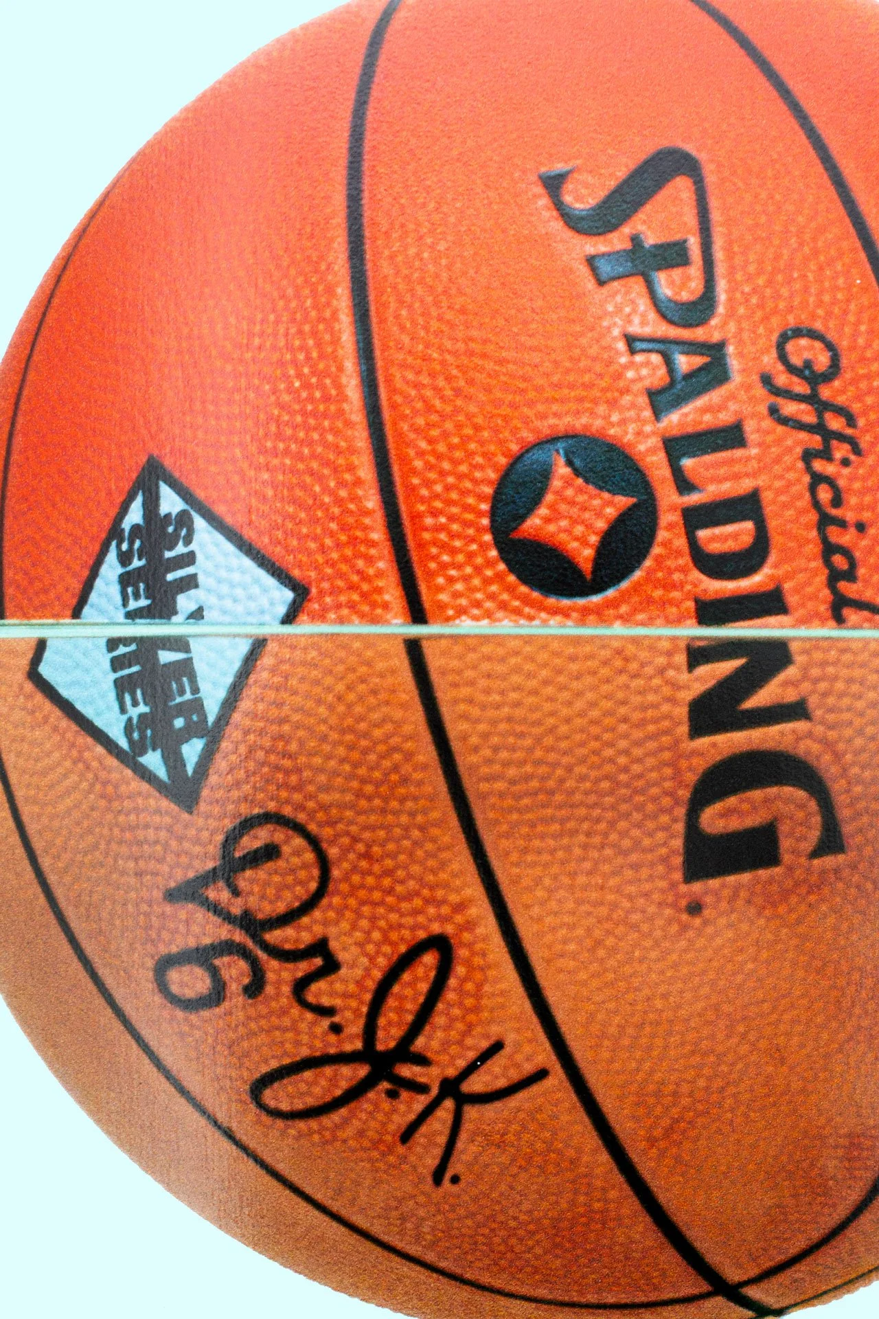 In Three Ball 50/50 Tank (Spalding Dr. JK Silver Series, Wilson Supershot) Skateboard, KOONS explores many of the same themes. The installation showcased on the triptych included three basketballs floating inside a tank. Because of their inflatable nature, half of each ball is always submerged in water with the only movement being horizontal. This is a reference to being alive, filing our lungs with air, moving horizontally from the womb to the eternal.