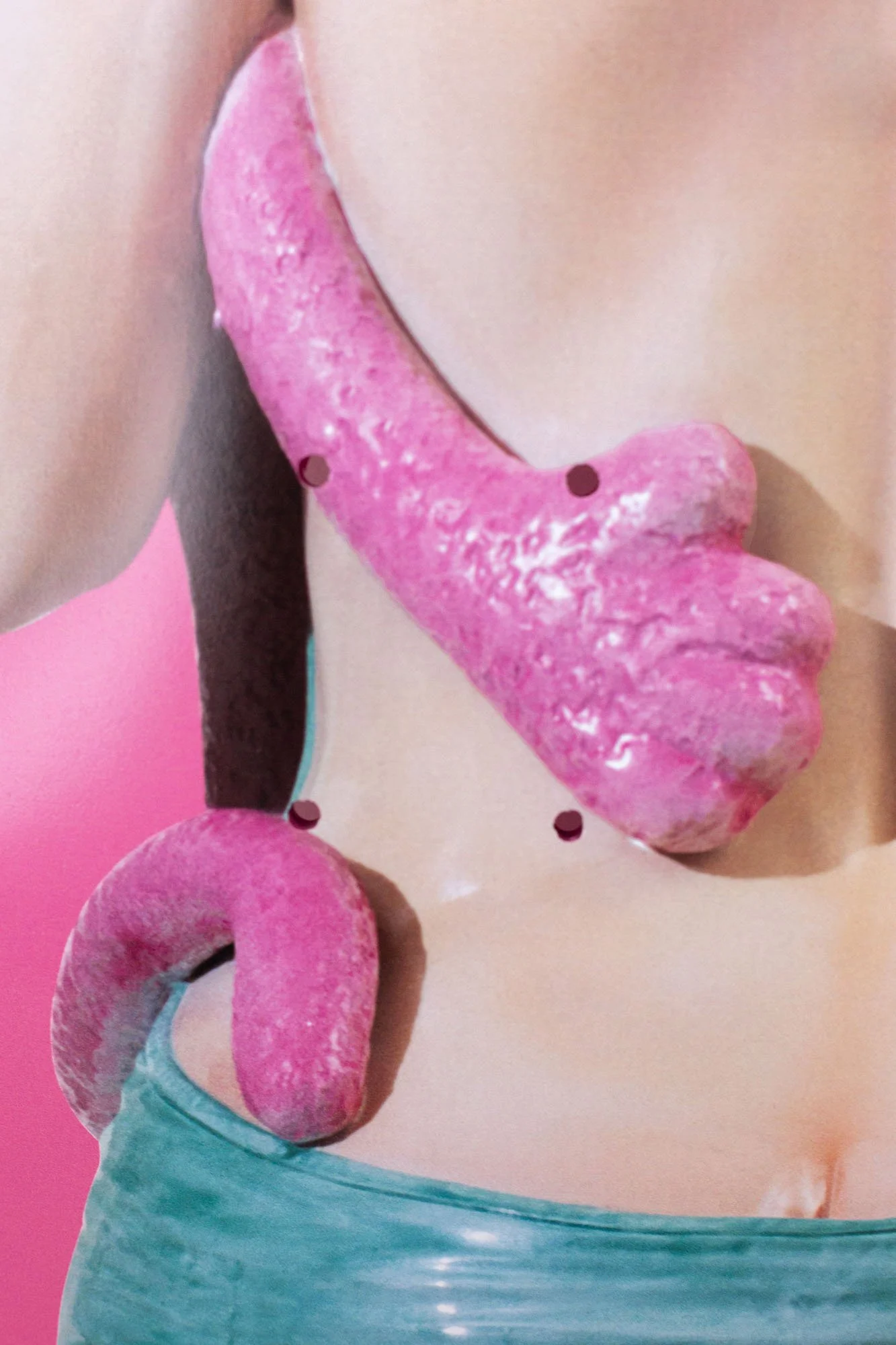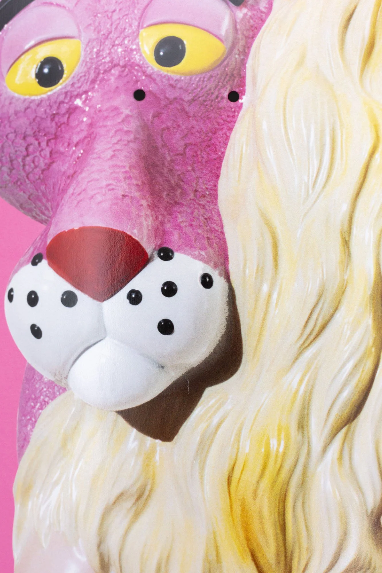 Finally, the face of the Pink Panther appears on the bright pink diptych, caught in the embrace of a glamorous, smiling woman. Taken from KOONS’ Banality series (first released in 1988), the artwork speaks to the guilt and shame of cultural consumption, using well-known imagery as a tool to represent the act of taking and giving up control.