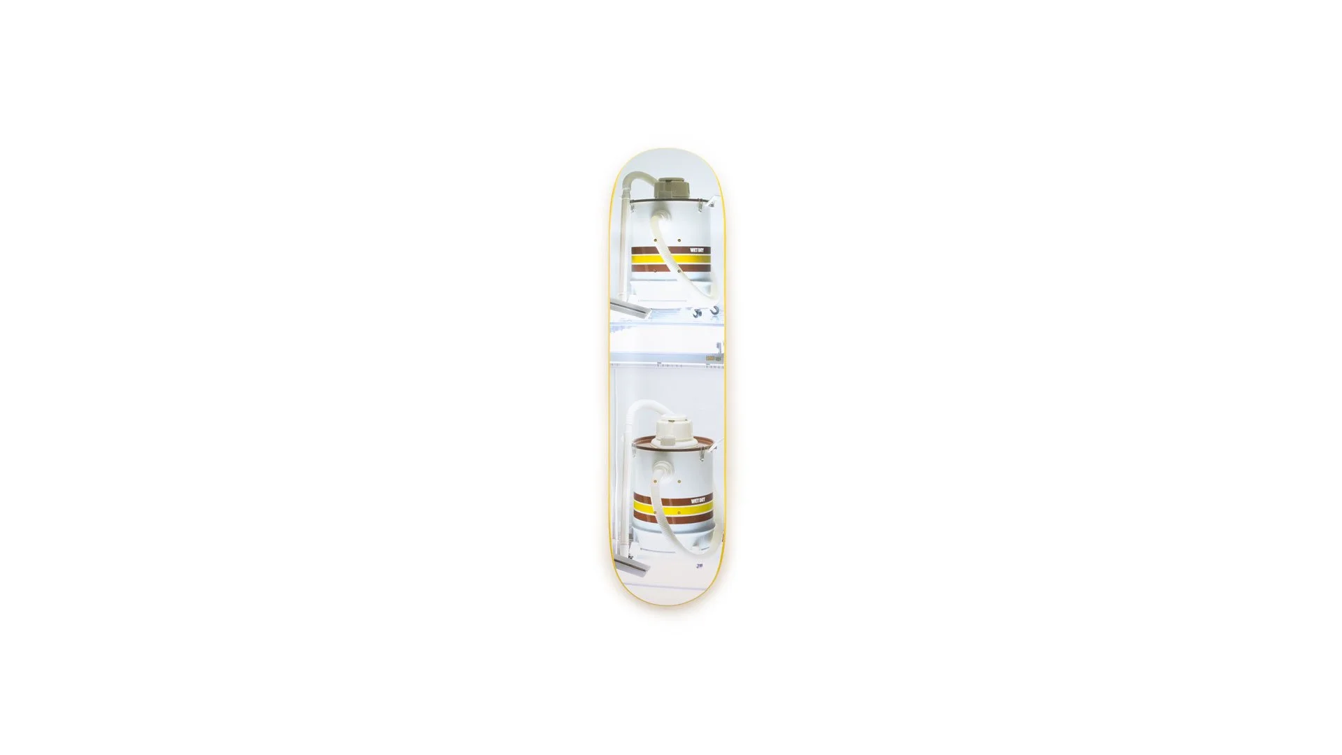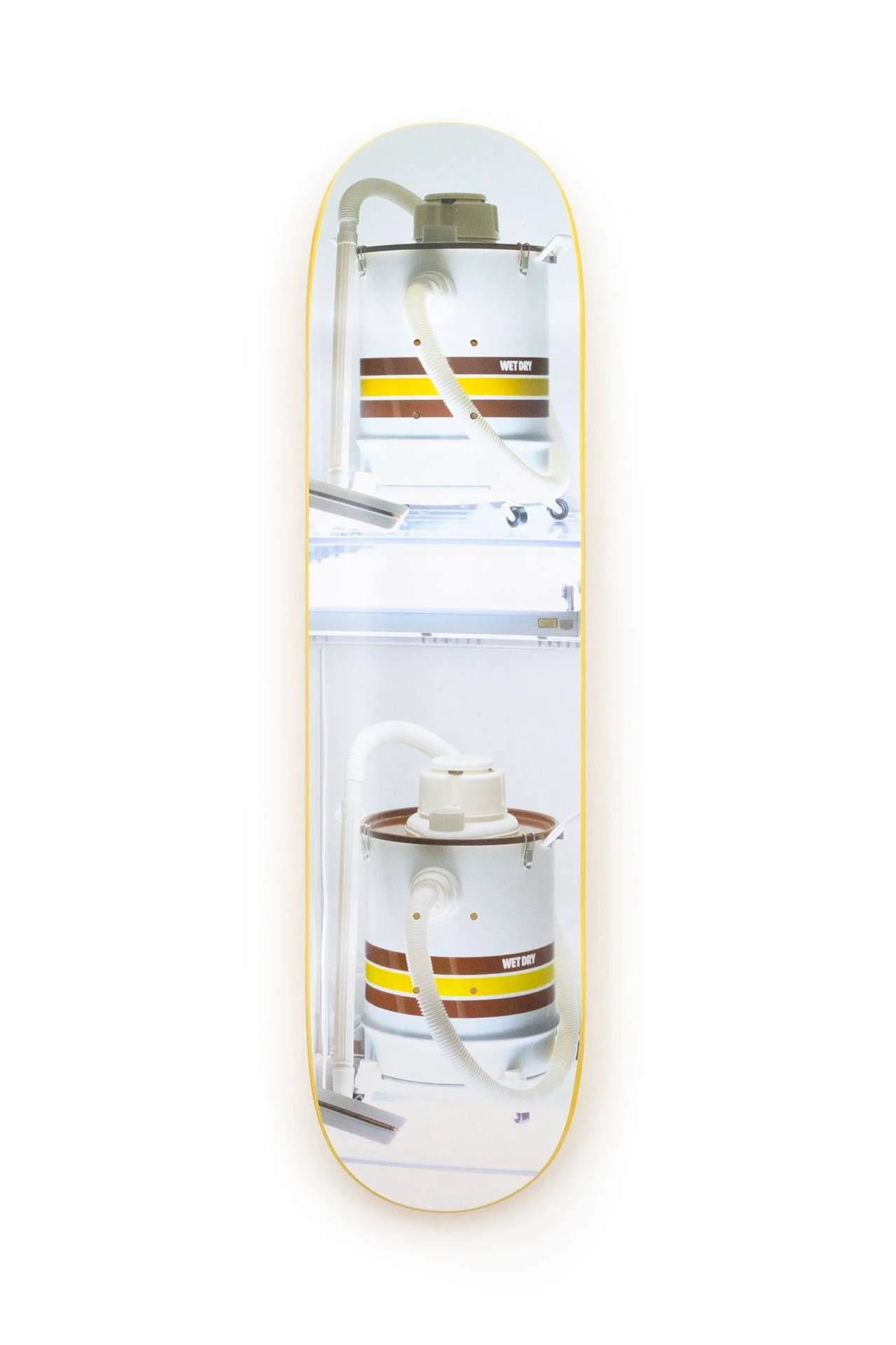 New Shelton Wet/Dry Doubledecker belongs to The New series, where Koons presented various cleaning appliances in pristine Plexiglas cases illuminated by cool white fluorescent lights, giving a glow that displayed a sense of newness and immortality. Drawn to the anthropomorphic features of the Wet/Dry, Koons was interested in the idea of breath, a symbol of life energy, and the philosophical references. The Wet/Dry logo being in dialogue with the duality of Kierkegaard’s Either/Or and Sartre’s Being and Nothingness. The New Shelton Wet/Dry Doubledecker Skateboard depicts a close-up image of the sculpture, which belongs in the collection of the Museum of Modern Art in New York City.