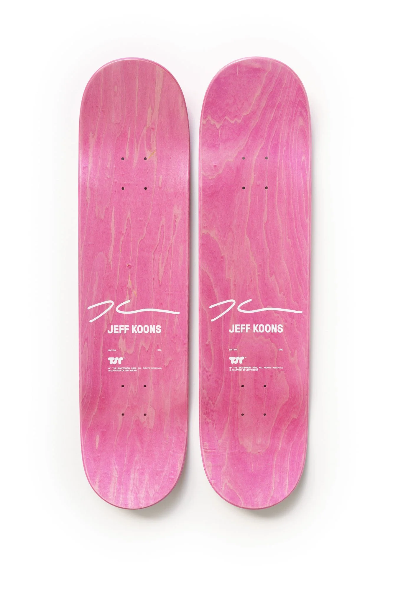 The editions each depict a classic artwork from Jeff KOONS’ masterful oeuvre. The New Shelton Wet/Dry Doubledecker Skateboard presents an encased vacuum cleaner sculpture from the artist’s The New series. These common household objects may be objects and yet they are “breathing”. It ties to the philosophies of both Kierkegaard and Sartre, exploring the duality of human nature, ethics, psychoanalysis and the link between artist and man.